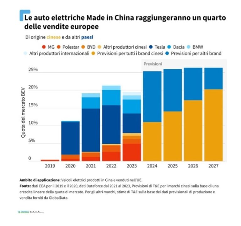 Nel dettaglio, una analisi di Transport & Environment (T&E) ha evidenziato che quasi un quinto (19,5%) dei veicoli elettrici venduti in Europa l’anno scorso è stato prodotto in Cina – una quota che in Italia raggiunge già il 23% – e che questa salirà a un quarto (25%) nel 2024.