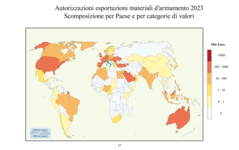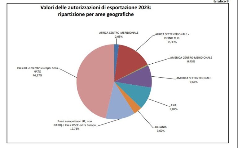 Sul sito del Senato ha fatto la sua comparsa nei giorni scorsi la ‘Relazione sulle operazioni autorizzate e svolte per il controllo dell’esportazione, importazione e transito dei materiali di armamento’ relativa al 2023. Un documento corposissimo (complessivamente supera le 2.000 pagine) che tra le altre cose offre una dettagliata rappresentazione dei flussi, crescenti, di armi in uscita dalla Penisola e dei paesi verso i quali queste sono dirette.