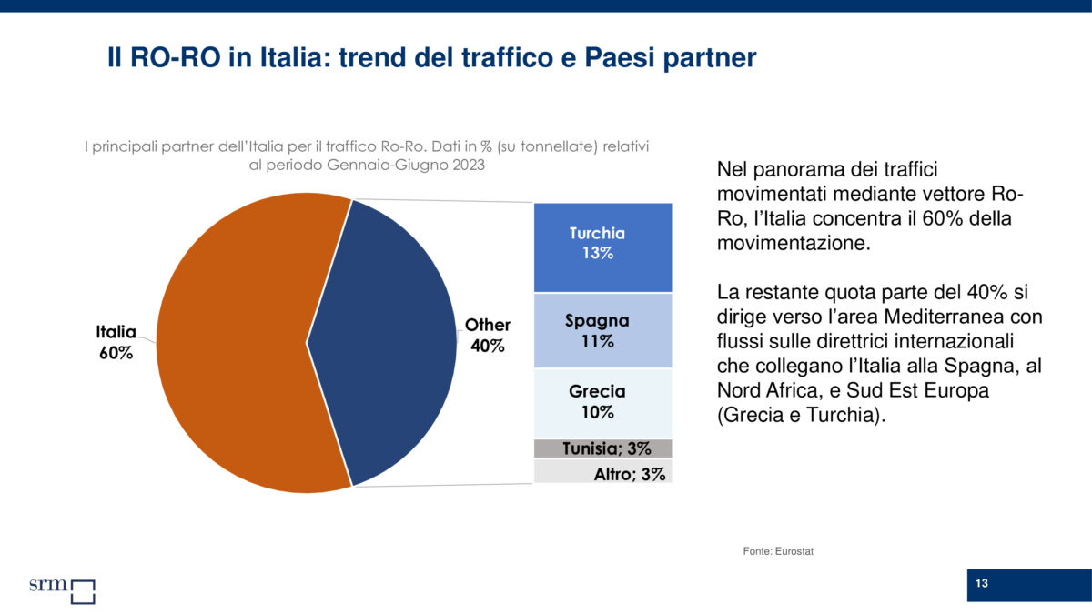 Guardando quindi al totale dei volumi movimentati con la modalità ro-ro per via marittima, l’Italia è in Europa al primo posto con 71,954 milioni di tonnellate (e una quota di mercato in Ue del 23%), seguita a grande distanza dalla Svezia (34,094 milioni), dalla Germania (27,727 milioni), dalla Grecia (24,999 milioni) e dalla Spagna (23,524 milioni).