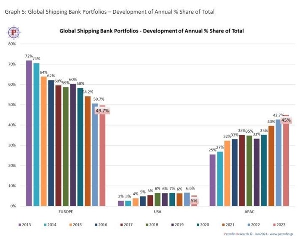 Gli Stati Uniti restano limitati nel loro ambito, mentre l’Europa ha registrato un declino marginale. Le banche giapponesi (che finanziano quasi esclusivamente realtà aziendale connazionali) attualmente dominano il settore finanziario del trasporto marittimo globale con il 22% delle prime 40 banche.