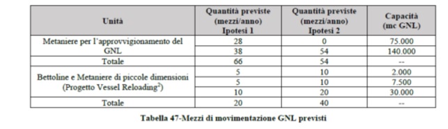Dall’attuale previsione di 123 navi l’anno, si passerà quindi a un range stimato di 86-94, comprensivo delle bettoline del progetto di Gnl small scale (denominato “vessel reloading”, presentato separatamente e già approvato), come da seguente tabella. La portata massima prevista sarà di 140mila mc.