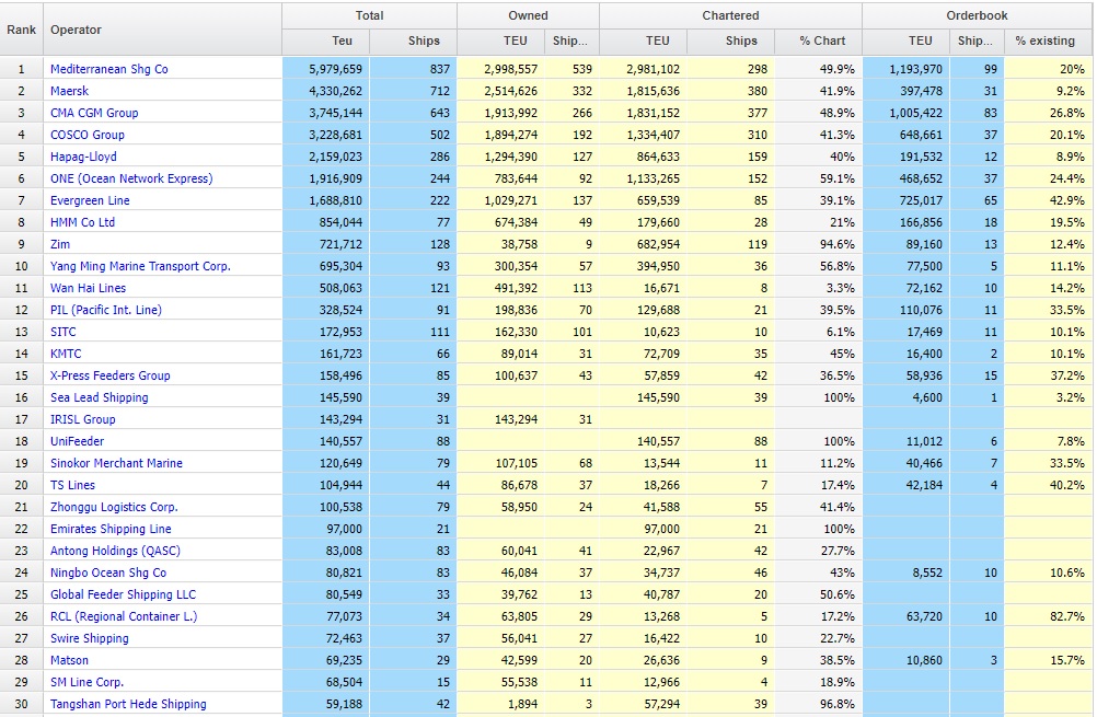 Secondo il costante aggiornamento stilato dalla società di ricerca e analisi Alphaliner, l’armatore svizzero controlla al momento il 20% dell’intera stiva disponibile al mondo (quasi 6 milioni di Teu su poco più di 30 totali che sono suddivisi fra un po’ più di 7.000 navi per 358 milioni di Tpl). Maersk è molto staccata al secondo posto, con 4,3 milioni (14,5% della capacità totale), seguita da Cma Cgm (3,7 milioni, 12,5%), Cosco (3,2 milioni, 10,8%) e Hapag-Lloyd (2,1 milioni, 7,2%).
