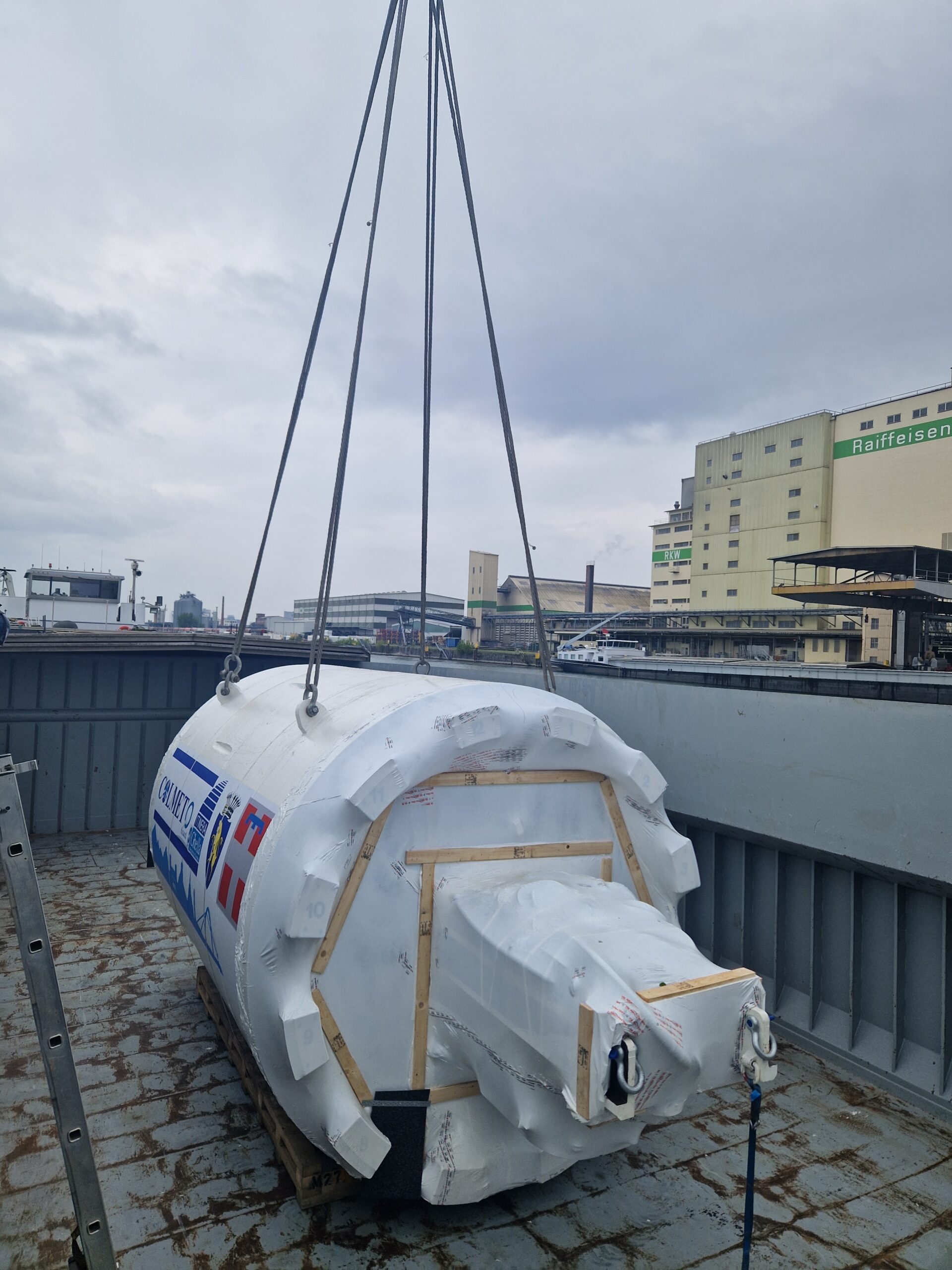 L’itinerario della spedizione, spiega Savino Del Bene, ha seguito un percorso articolato, sfruttando diverse modalità di trasporto per garantire la massima efficienza e sicurezza. La spedizione ha avuto inizio a Schwanau, dove i quattro pezzi, eccezionali per dimensioni e peso, sono stati caricati su camion presso lo stabilimento del produttore e trasportati fino al porto fluviale di Kehl. Da qui, il viaggio di “Gaia” è proseguito su una chiatta che ha navigato lungo il Reno fino a Rotterdam.