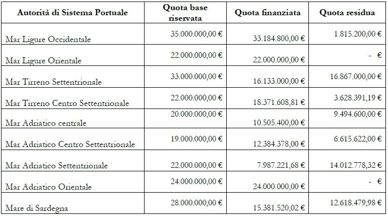 Anche gli enti virtuosi potranno tuttavia partecipare alla call, dato che ciò che non sarà assegnato verrà attribuito “fino ad esaurimento delle risorse e secondo un’unica graduatoria, che non tiene conto del principio di ripartizione citato, alle proposte progettuali che avranno ottenuto il punteggio maggiore da parte della commissione e che, pur giudicate ammissibili da parte di quest’ultima, non sono risultate finanziabili per la saturazione delle risorse di spettanza di ogni singola Adsp”.
