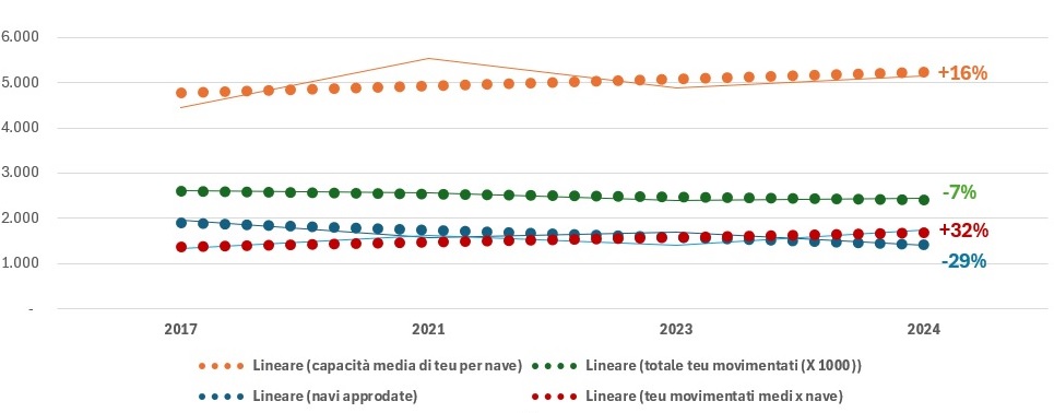 Il gigantismo, in sintesi, aumenta i costi complessivi per quanto li riduca per unità di carico. Il punto è capire come gestirlo (e non solo ovviamente in ottica di servizi tecnico-nautici) se, come è il caso di Genova (si veda il grafico seguente), i volumi complessivi non crescono al crescere delle dimensioni medie delle navi in arrivo.