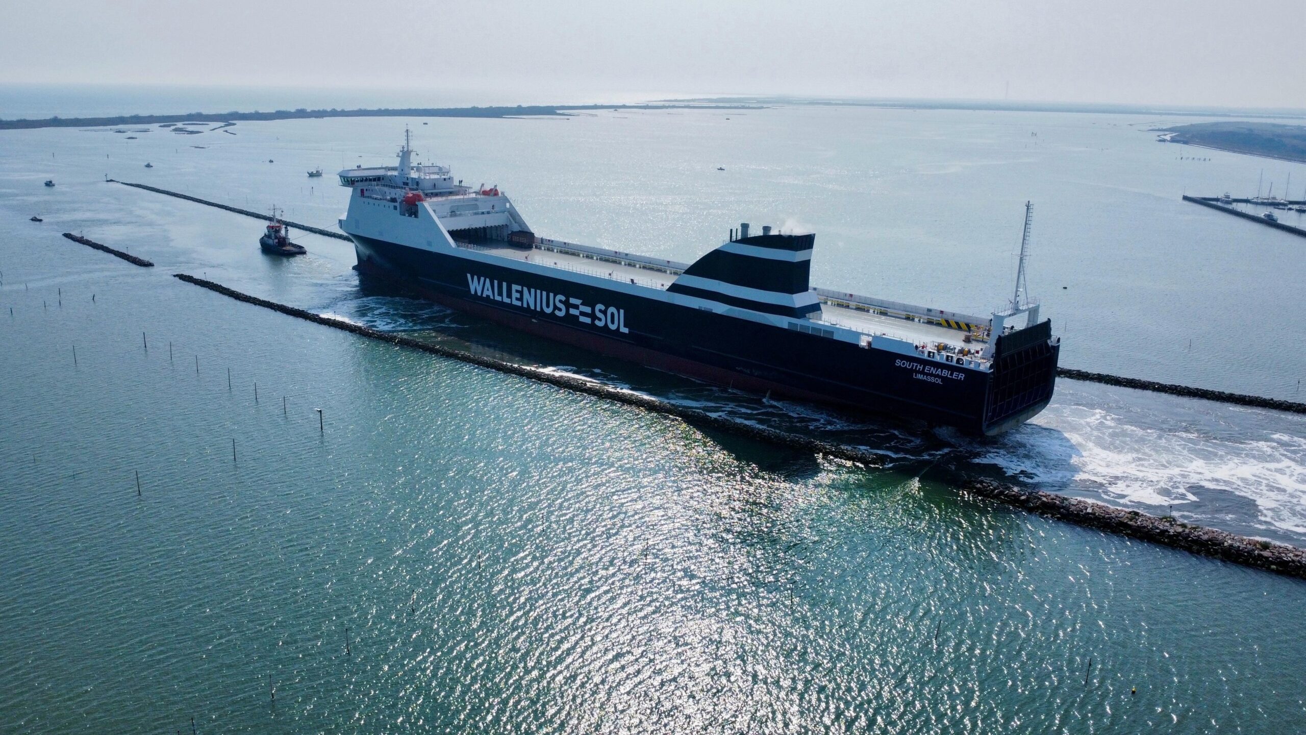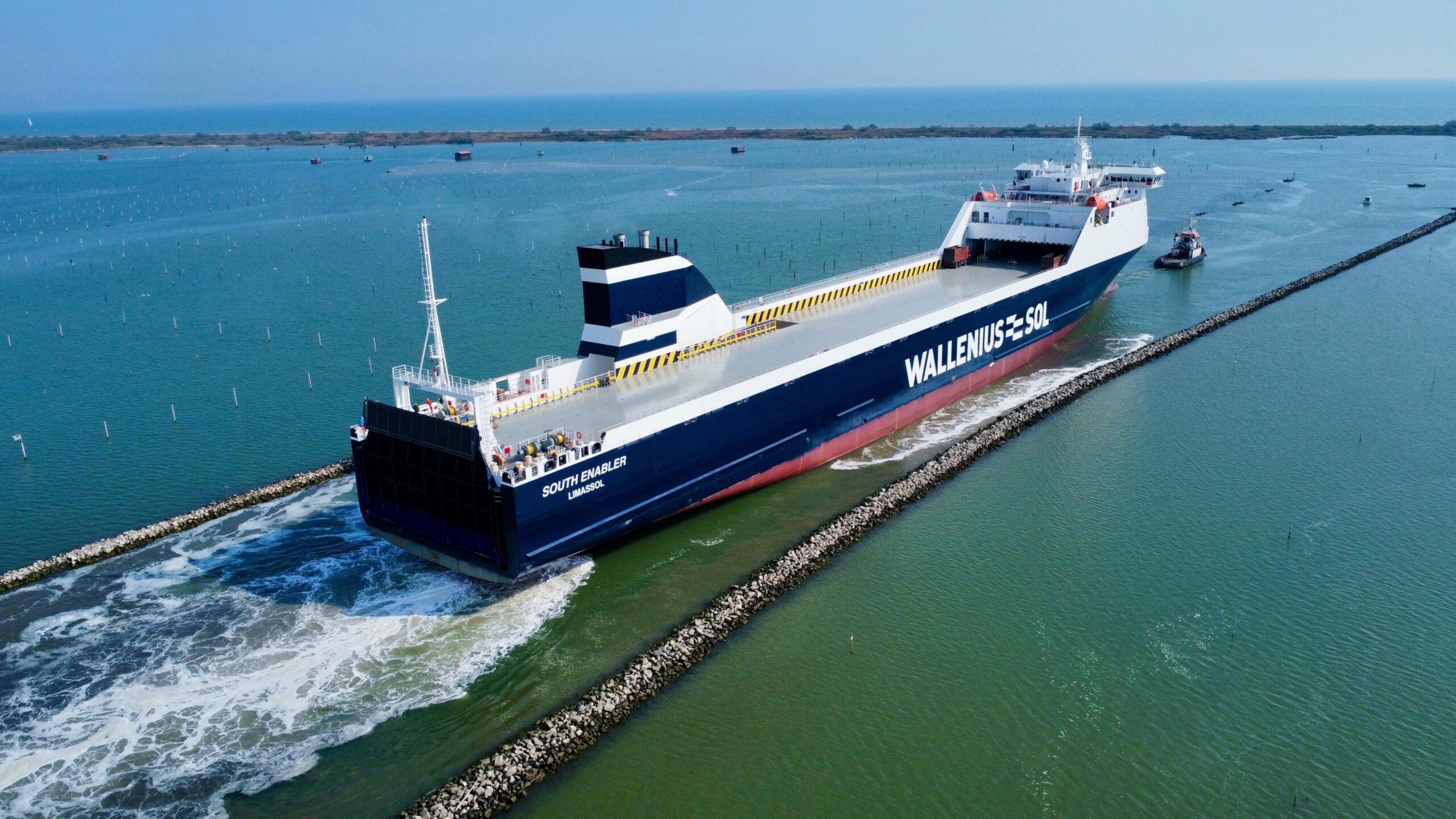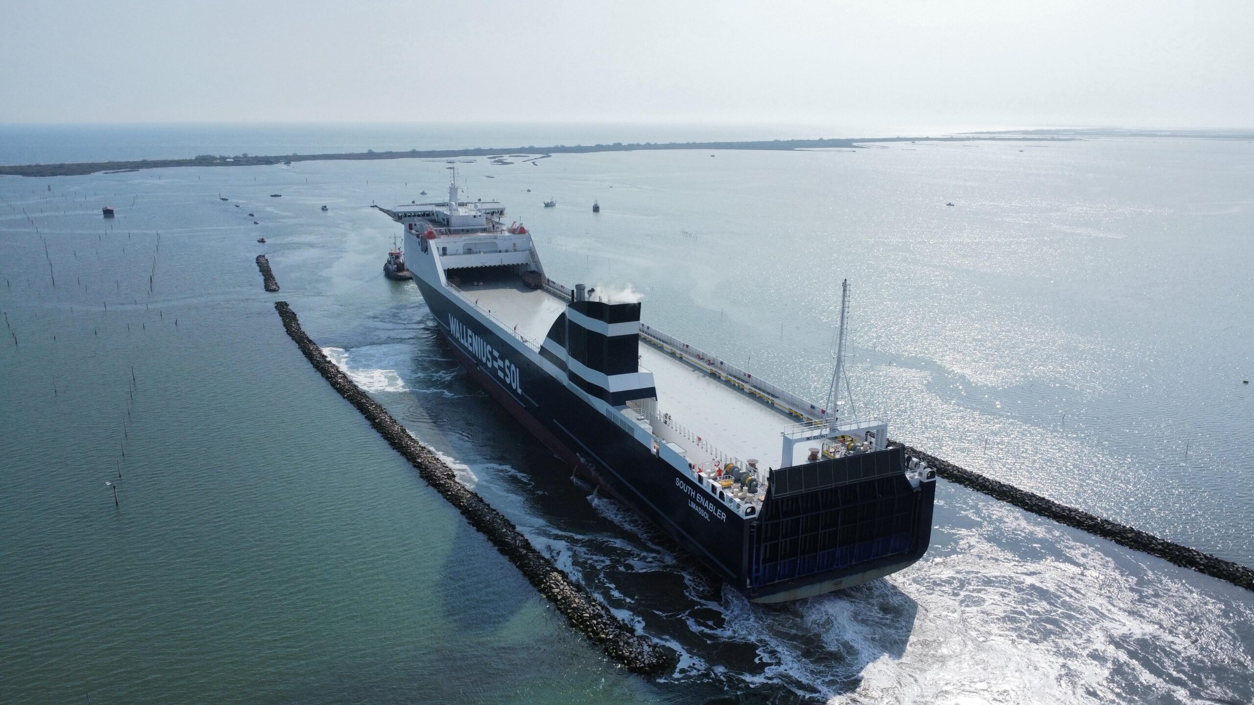 Il completamento del dragaggio alla foce del fiume Po di Levante ha consentito l’uscita del nuovo ro-ro destinato a Mann Lines (Wallenius Sol)