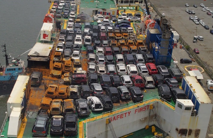 I ro/ro Grimaldi come la Grande Costa D’Avorio trasportano migliaia di auto usate dagli Stati Uniti all’Africa, inclusi veicoli così danneggiati da non potersi muovere e veicoli non funzionanti che devono essere spinti a bordo.
