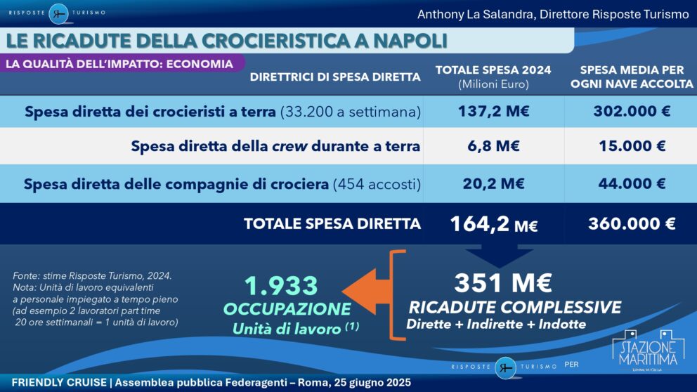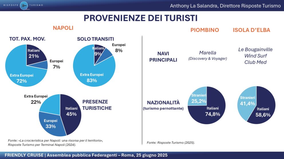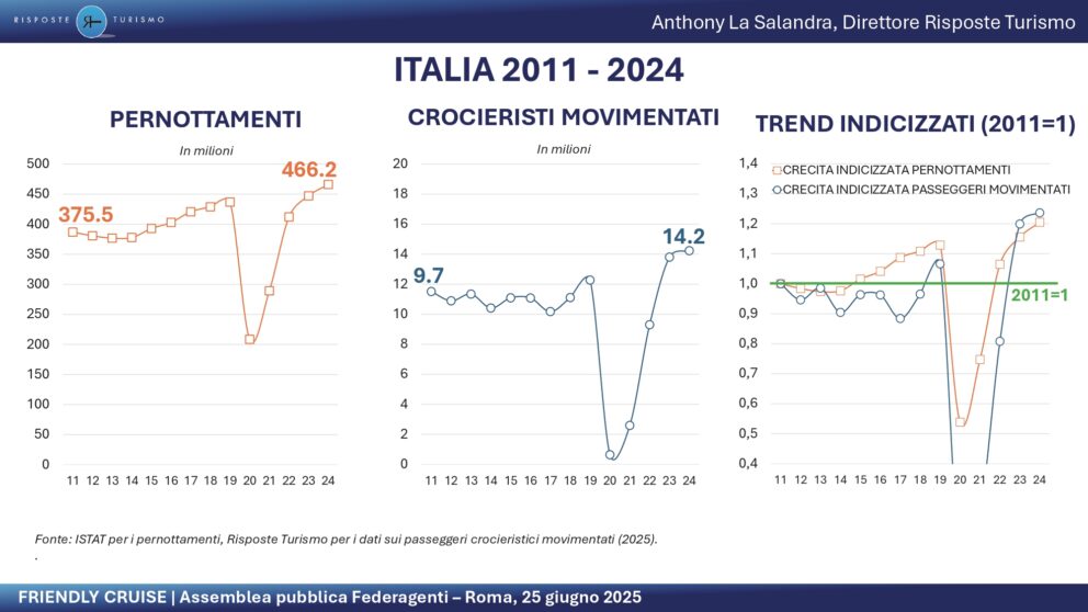Anthony La Salandra (Risposte Turismo) ha evidenziato che in Italia nel 2024 i pernottamenti di turisti hanno raggiunto un picco di 466,2 milioni mentre i crocieristi imbarcati e sbarcati nei porti dello Stivale sono stati 14,2 milioni.