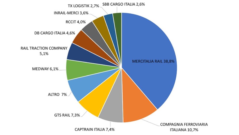 Il primo elemento di interesse riguarda la prima posizione, occupata prevedibilmente ancora da Mercitalia Rail, ora con una quota del 38,8%.