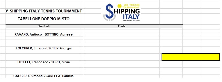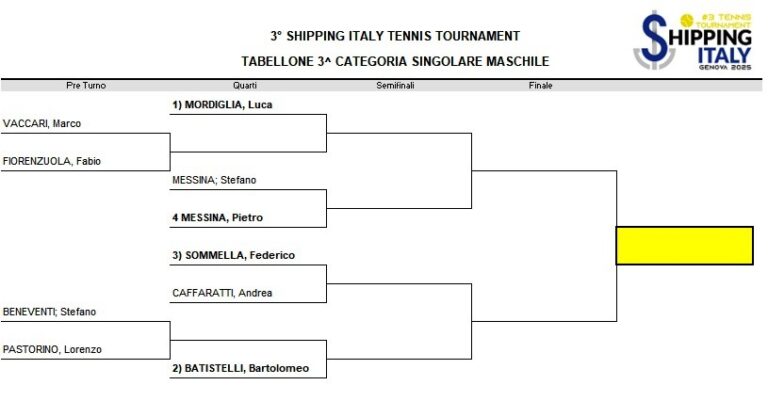 Nel tabellone di terza categoria la testa di serie n.1 è invece Luca Mordiglia (studio legale Mordiglia), mentre a seguire i favoriti sono Bartolomeo Batistelli (Bossi & C. Transiti), Federico Sommella (Clever Synergy) e Pietro Messina (Nova Marine Carriers). Per quest’ultimo il primo incontro sarà un match in famiglia contro il padre Stefano Messina (Assarmatori e Ignazio Messina & C.).