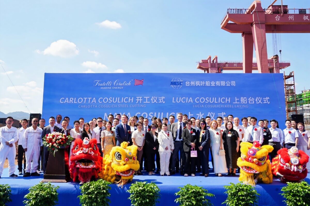 Dopo appena cinque mesi dall’impostazione della chiglia, la nuova nave bettolinea Maya Cosulich del gruppo Fratelli Cosulich è stata ora varata in Cina presso il cantiere Taizhou Maple Leaf. Si tratta della prima nave adibita al trasporto e al rifornimento di metanolo oltre che di bunker ‘tradizionale’. Nella stessa occasione è stata celebrata anche la posa della chiglia della nuvoa costruzione Lucia Cosulich e il ptaglio della prima lamiera della Carlotta Cosulich che seguiranno nei mesi a venire.