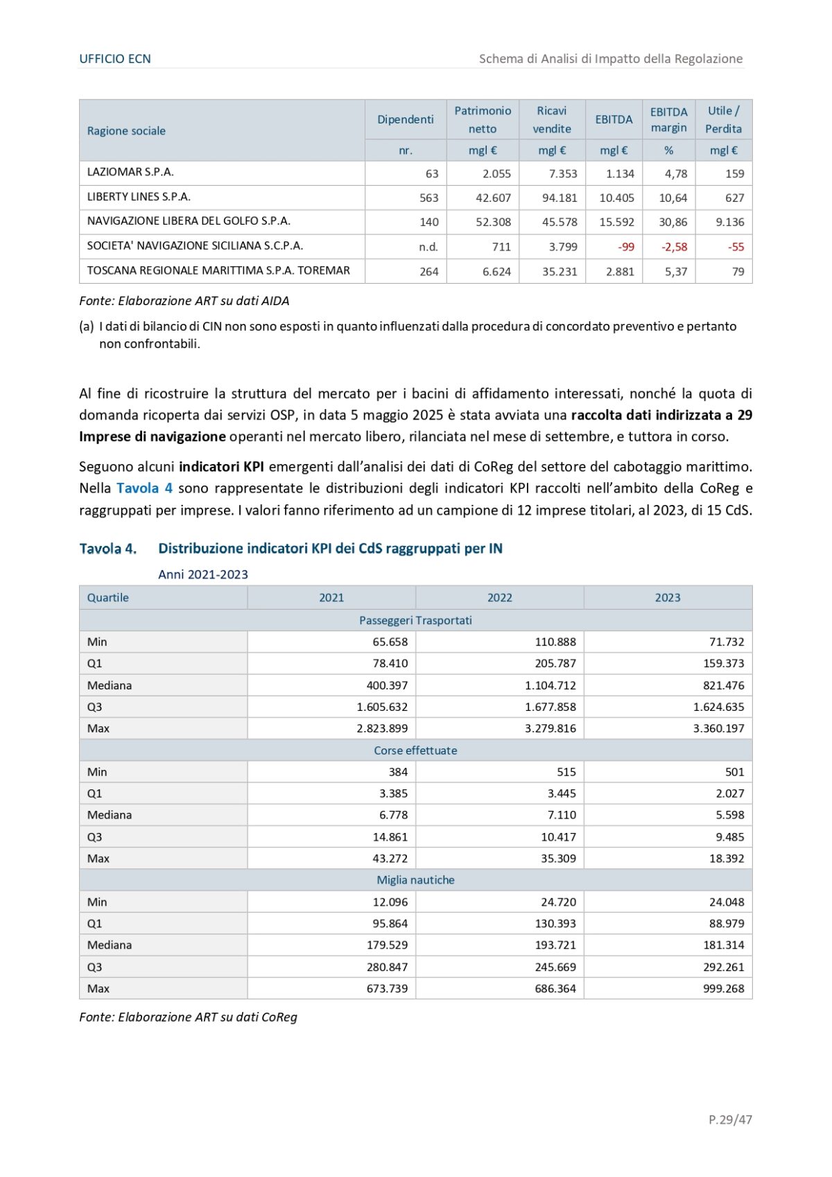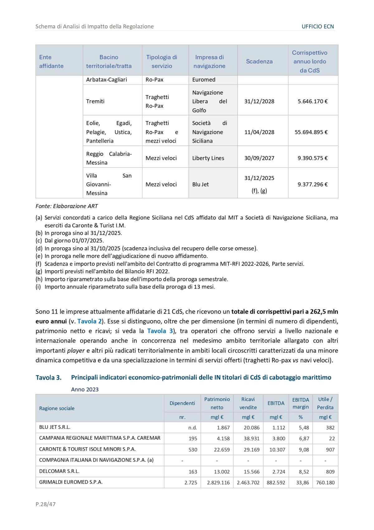 Nella relazione illustrativa del documento di consultazione si legge che “si è ritenuto necessario intervenire anche sulle altre misure contenute nella delibera n. 22/2019, al fine di completare e rafforzare in particolare le misure regolatorie per l’affidamento dei servizi, e al contempo adeguare gli aspetti applicativi dell’atto regolatorio al mutato quadro normativo ed economico di riferimento”. L’Art poi aggiunge che, “con riguardo al contesto economico di riferimento, ci si riferisce alla particolare struttura di mercato dei servizi di cabotaggio con le isole minori, dove si rileva un limitato livello concorrenziale e la presenza di operatori che hanno consolidato la loro posizione nel tempo nei rispettivi bacini geografici di interesse”.
