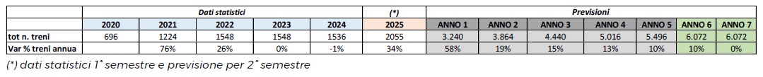 L’andamento standard per Savona prevede “cautelativamente un traffico sempre costante per tutta la durata della concessione prendendo come valori i dati attuali incrementati del numero di treni già oggi richiesti e contrattualizzati. Dalla analisi dei dati statistici emerge che dal 2020 si è avuto un considerevole incremento del traffico su Savona (più che triplicato) causato prevalentemente dall’attivazione di un trasporto via treno di autovetture che si prevede vada a regime nel 2026 in considerazione del fatto che già ad oggi vi è tale possibilità di incremento”.