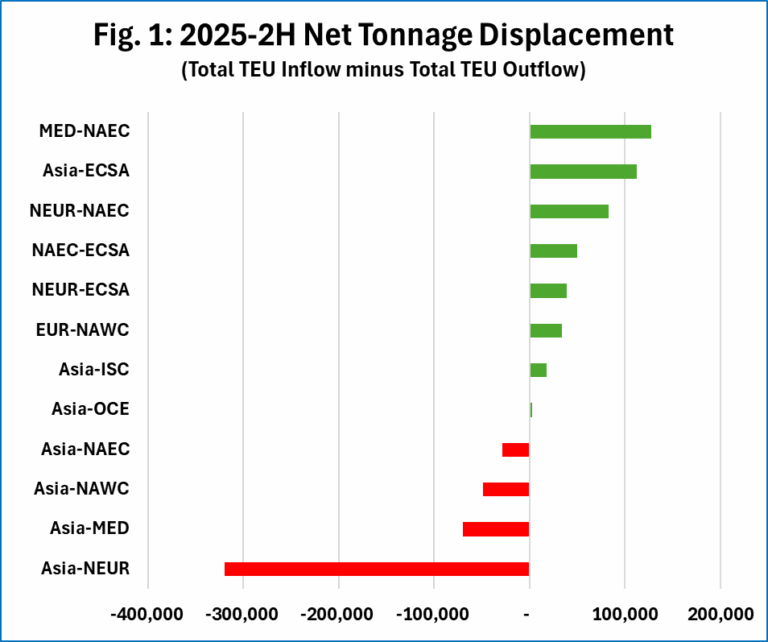 Il fenomeno, rilevano gli analisti, è visibile chiaramente se si guarda ai dati relativi alla seconda metà del 2025, i quali indicano come principale beneficiaria di questa capacità aggiuntiva il trade Mediterraneo – costa est del Nord America, con una stiva extra netta (saldo tra quella in arrivo e quella poi riversata su altre rotte) di 127.686 Teu, a seguito dell’arrivo di una capacità eccedente di 178.189 Teu dal trade Asia – Med tramite il dislocamento di 11 portacontainer con capacità di 14-15mila Teu.