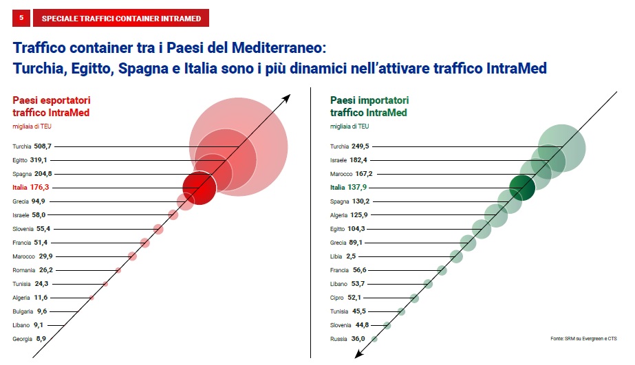 Che in questa edizione ha dedicato un approfondimento ai traffici container “intramed”, un focus specifico sul bacino del Mediterraneo, dove vengono analizzati i paesi più competitivi e i porti che sviluppano i maggiori volumi di questo segmento di traffico.