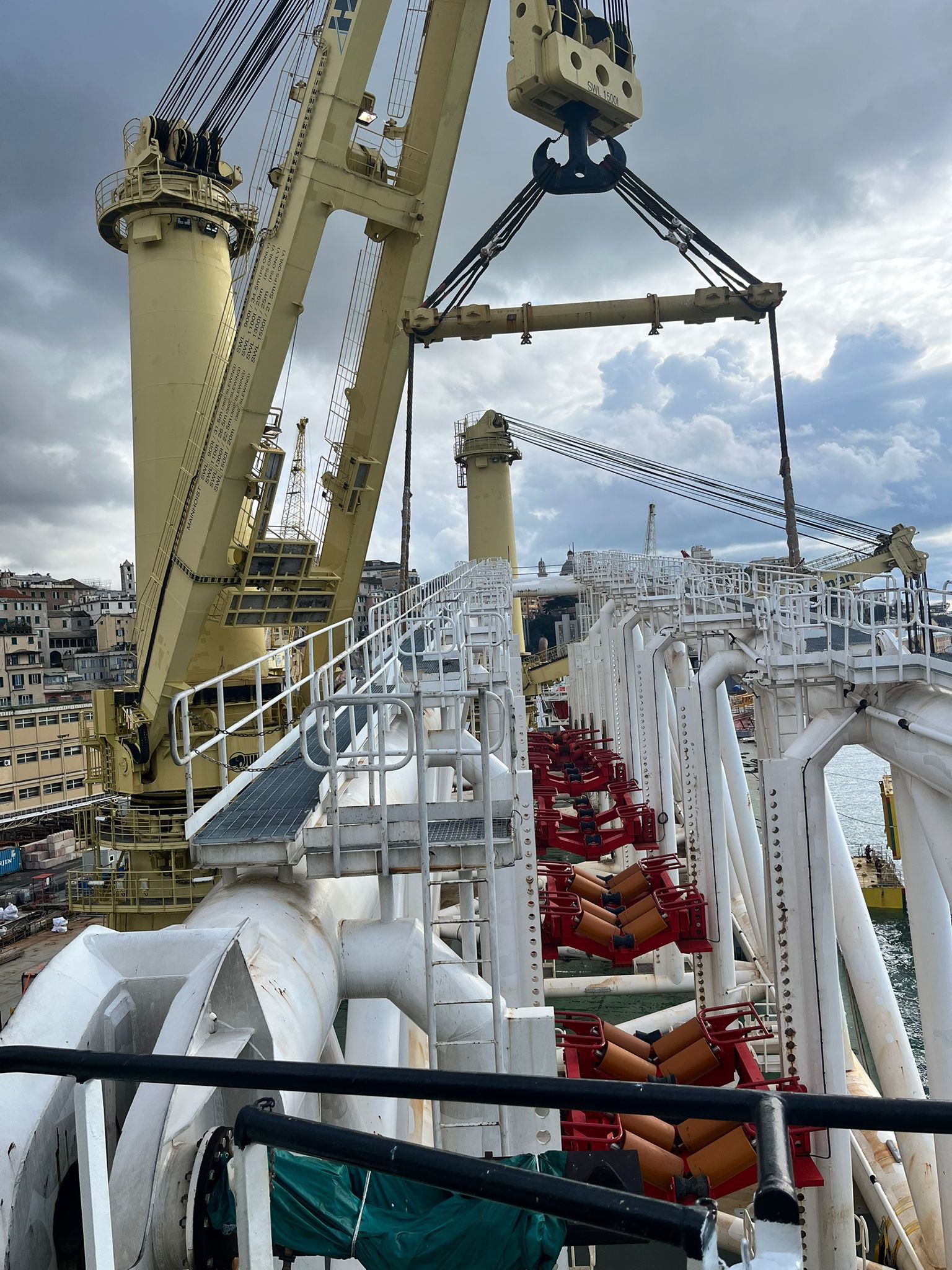 Dal porto indonesiano di Karimun è stato trasportato via mare fino al capoluogo ligure e sbarcato sulla chiatta Arcalupa (di proprietà di Gin Maritime Operation, società anch’essa come il cantiere parte del gruppo Genova Industrie Navali) affiancata alla banchina di Calata Boccardo, uno stinger da circa 1.200 tonnellate di peso, lungo 84 metri, largo 18 e alto 18,5 metri. Le delicate fase di movimentazione e sbarco si sono completato quando l’imponente impianto è stato posizionato su diverse basi (stoods) alte 6 metri che erano state preventivamente allestite.