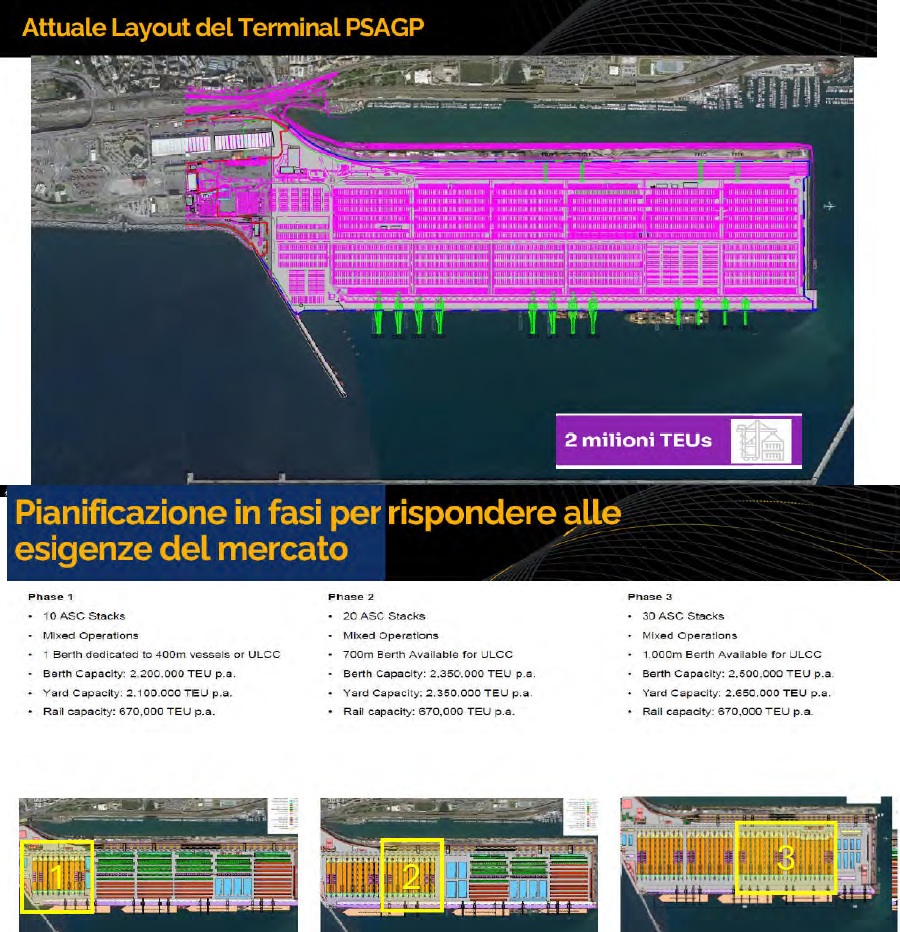 La tempistica non è definita, ma l’investimento avverrà in tre fasi (rispettivamente da 208 milioni, 188,95 milioni e 490,35 milioni di euro, per un totale di 887,3 milioni di euro, pari a circa 1 miliardo di dollari). Il grosso (537 milioni) saranno investimenti in equipment. A far la parte del leone (320 milioni di euro) saranno le 30 (più verosimilmente 40: c’è un’incongruenza di costo nelle slide) Asc (Automated stacking crane), le gru di piazzale a guida autonoma con “controllo da remoto”.